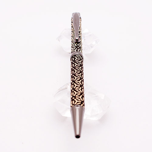 水に強く、通気性があり、丈夫なため、甲冑などの武具に使われ、400年以上の歴史がある伝統工芸品です。その印伝をボールペンに仕上げました。
