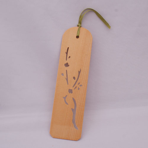 ■木の香りのしおり 梅 透かし彫りの技法を使って、一枚一枚仕上げたしおりです。 柄は梅。 材は檜です。 ※紐の色は下記から選べます。ご注文の際、備考欄にご記入ください。 ご記入がない場合は、写真の若草色でお送りします。 ■紐の色(紐の実際の色は、他の根付をご覧ください) 水色 緑 若草色 ピンク ■サイズ 14cm×3.5cm