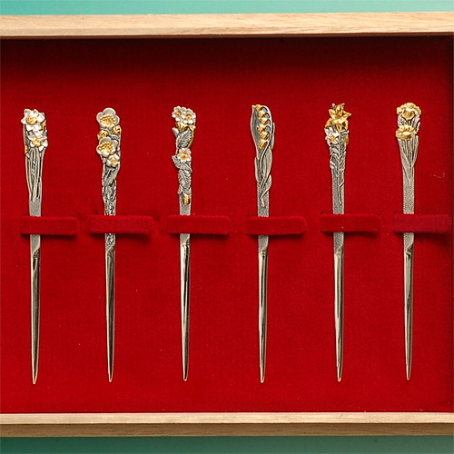 日本の伝統技法を駆使して銀製和楊枝に、精細な彫金と彩金仕上げを施した、12ヶ月の菓子切り(和楊枝)を作成いたしました。