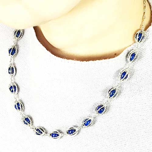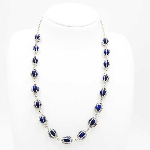 シルバーかご型ラピスラズリネックレス ショート。上品ながらも存在感のあるアクセサリーが欲しい方にオススメです。ラピスラズリの深い青色が印象的で、シルバーのかご型パーツの連なりがエレガントな雰囲気を演出します。